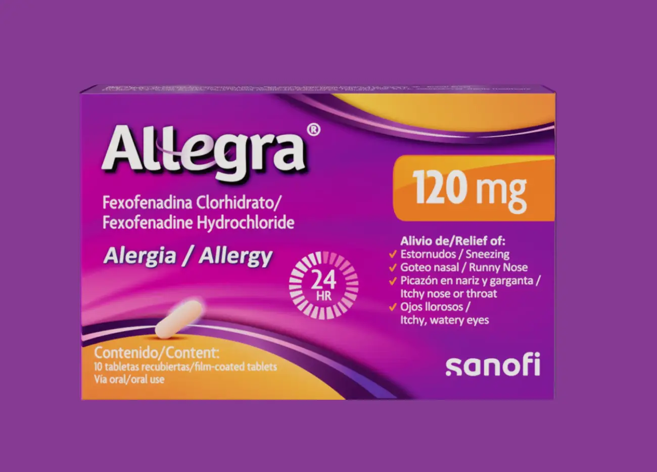 Allegra® Posología: tabletas recubiertas 120mg: Adultos y niños de 12 años de edad una vez al día con agua. Suspensión oral: para la rinitis alérgica estacional, niños de 2 a 11 años 30mg ( 5ml) dos veces al día. Para la urticaria idiopática crónica: niños de 2 a 11 años, 30mg (5ml) dos veces al día. Pacientes de 6 meses a 2 años 15mg (2.5ml) dos veces al día. Indicaciones: tabletas recubiertas, alivio de los síntomas asociados con la rinitis alérgica. Suspensión oral, tratamiento de los síntomas asociados con la rinitis alérgica estacional en niños de 2 a 11 años de edad; y en el tratamiento de los síntomas asociados con la urticaria idiopática crónica en niños de 6 meses a 11 años. Contraindicaciones y Advertencias: Contraindicado en pacientes con hipersensibilidad conocida a cualquiera de sus componentes. No administrar clorhidrato de fexofenadina 120mg en niños menores de 12 años. Puede administrarse durante el embarazo o lactancia solo si el beneficio potencial compensa el riesgo potencial para el feto o infante. Si los síntomas persisten consulte a su médico. TODO MEDICAMENTO DEBE CONSERVARSE FUERA DEL ALCANCE DE LOS NIÑOS Nro. Registro Sanitario: Allegra 120mg 30127-02-12, Allegra Pediátrico 30mg/5ml 29322-08-10 VENTA LIBRE