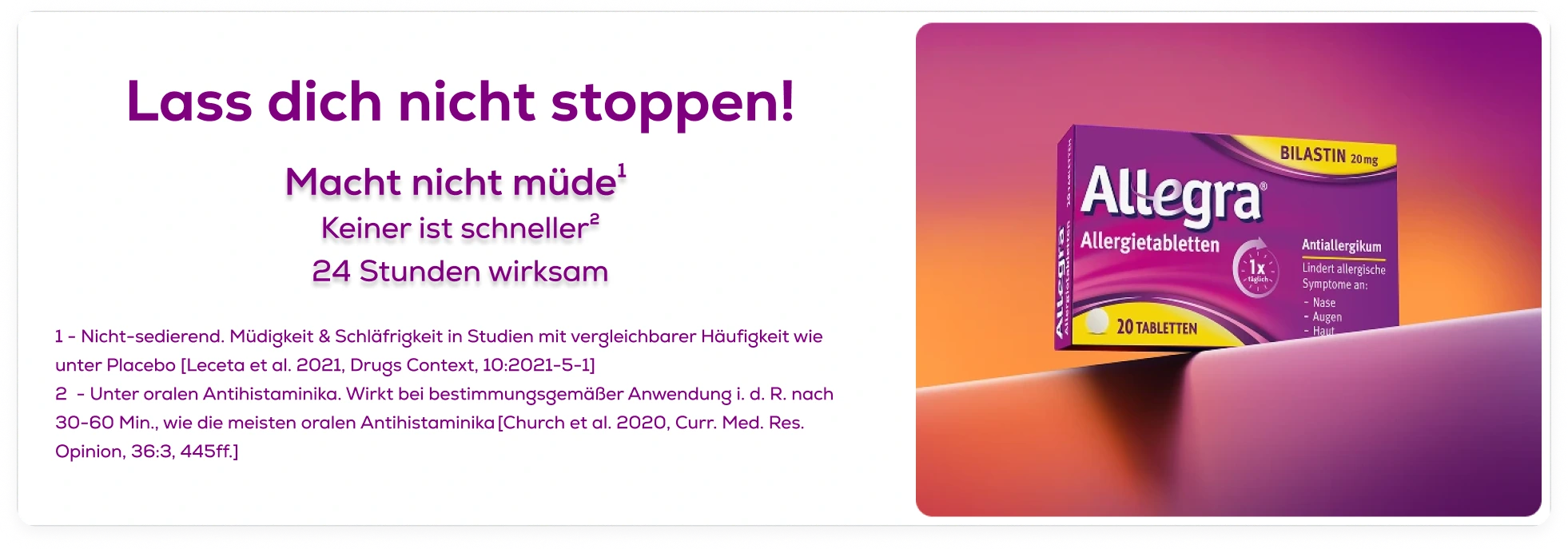 Bilastin hingegen dringt nicht ins Schlafzentrum vor, wo Müdigkeit entsteht. Es wirkt auf die Histaminrezeptoren, die Allergiesymptome wie Juckreiz, Niesen und eine laufende Nase verursachen. So können die Antiallergika von Allegra® mit Bilastin Deine Symptome lindern, ohne dass es zur ungewollten Nebenwirkung Müdigkeit1 kommt.
